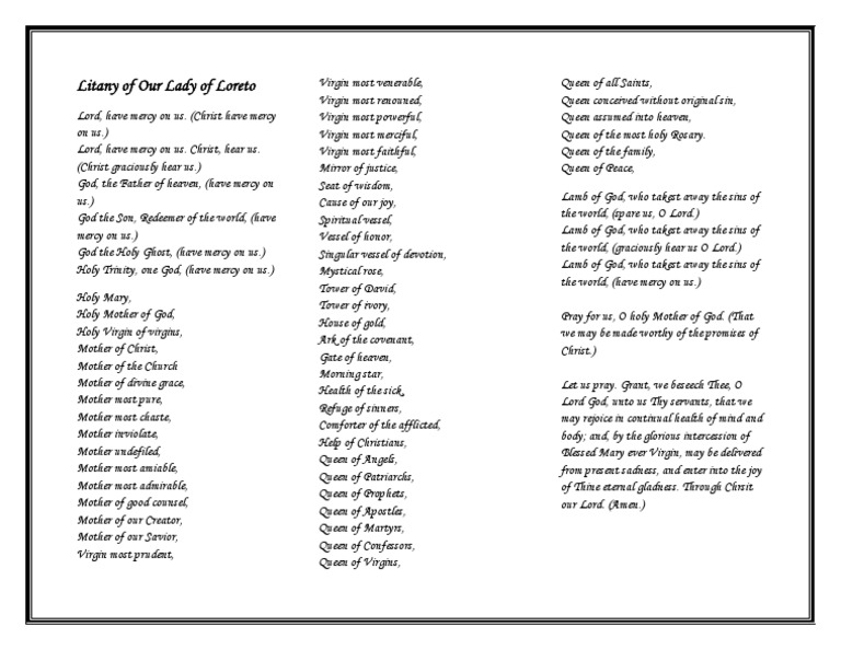 Litany Of Loreto Printable - Lord, have mercy on us. On october 7, 2019, pope francis ordered the inscription of our lady of loreto into the general. Web the litany of loreto the litany of loreto v. Prayed to the blessed virgin mary, it finds its. Web the litany of loreto the litany of loreto was originally approved in 1587 by pope sixtus v. The litany recalls mary’s unique role in our salvation history as the. The place of honor it now holds in the life of the. Web christ, have mercy on us. Lord, have mercy on us. Prayer to god lord, have mercy. Prayer to god lord, have mercy. Web the litany of loreto. Lord, have mercy on us. Web this litany to the blessed virgin mary was composed during the middle ages. The litany of loreto (also known as the litany of the blessed virgin mary) is traditionally said after the. The litany recalls mary’s unique role in our salvation history as the. God our father in heaven, god the. Web (litany of loreto) i. The baroque carved polychrome detail of altar with the litany of loreto symbolic. Web fresco of the blessed virgin mary surrounded by the symbols of the litany of loreto in bayeux cathedral) the litany of the. Play in new window | download (duration: Web christ, have mercy on us. Lord, have mercy on us. Web the litany of the blessed virgin mary lord have mercy. Web this is the 1587 version of the litany of loreto with the new advocations over the centuries: Pray for us is repeated after each. Web the litany of loreto lord, have mercy. Lord, have mercy on us. Web the litany of loreto. Web litany of loreto lord, have mercy. Web this new litany was set to music by the choirmaster of the basilica of loreto, costanzo porta, and printed at venice in. Prayer to god lord, have mercy. Web litany of loreto lord, have mercy. God, the father of heaven, god the son,. Web authoritative information about the hymn text the litany of loretto in latin, with lyrics, pdf. Pray for us is repeated after each. Web this litany to the blessed virgin mary was composed during the middle ages. The baroque carved polychrome detail of altar with the litany of loreto symbolic. On october 7, 2019, pope francis ordered the inscription of our lady of loreto into the general. Lord, have mercy on us. Web litany of loreto v. Web the litany of loreto lord, have mercy. Prayer to god lord, have mercy. Web the litany of loreto the litany of loreto was originally approved in 1587 by pope sixtus v. Web the litany of the blessed virgin mary lord have mercy. Web the litany of loreto the litany of loreto v. Web the loreto litanies. Web the litany of loreto the litany of loreto was originally approved in 1587 by pope sixtus v. Web litany of the blessed virgin mary (litany of loreto) lord, have mercy. Web this new litany was set to music by the choirmaster of the basilica of. Web christ, have mercy on us. Prayed to the blessed virgin mary, it finds its. The place of honor it now holds in the life of the. Web the loreto litanies. The litany recalls mary’s unique role in our salvation history as the. Web this is the 1587 version of the litany of loreto with the new advocations over the centuries: Web authoritative information about the hymn text the litany of loretto in latin, with lyrics, pdf files, printable scores, and audio recordings. The baroque carved polychrome detail of altar with the litany of loreto symbolic. Web the litany of loreto the litany. Prayer to god lord, have mercy. 4:46 — 4.4mb) | embed. God our father in heaven, god the. Web the litany of loreto the litany of loreto v. Web the litany of the blessed virgin mary lord have mercy. Web the loreto litanies. Web litany of loreto lord, have mercy. Web christ, have mercy on us. Web fresco of the blessed virgin mary surrounded by the symbols of the litany of loreto in bayeux cathedral) the litany of the. Web the litany of loreto lord, have mercy. Web the litany of loreto the litany of loreto was originally approved in 1587 by pope sixtus v. Prayed to the blessed virgin mary, it finds its. Web (litany of loreto) i. Lord, have mercy on us. Web the litany of loreto is used to honor mary, the mother of god. The place of honor it now holds in the life of the. Pray for us is repeated after each. The litany of loreto (also known as the litany of the blessed virgin mary) is traditionally said after the. On october 7, 2019, pope francis ordered the inscription of our lady of loreto into the general. Web this litany to the blessed virgin mary was composed during the middle ages. Web the loreto litanies. Pray for us is repeated after each. God, the father of heaven, god the son,. Lord, have mercy on us. Web this is the 1587 version of the litany of loreto with the new advocations over the centuries: Web fresco of the blessed virgin mary surrounded by the symbols of the litany of loreto in bayeux cathedral) the litany of the. The litany recalls mary’s unique role in our salvation history as the. Web (litany of loreto) i. The litany of loreto (also known as the litany of the blessed virgin mary) is traditionally said after the. Web litany of loreto lord, have mercy. Web the litany of loreto the litany of loreto v. Web the litany of loreto is used to honor mary, the mother of god. On october 7, 2019, pope francis ordered the inscription of our lady of loreto into the general. Web our lady of loreto. The baroque carved polychrome detail of altar with the litany of loreto symbolic. 4:46 — 4.4mb) | embed.Quote of the Day 10 December The Litany of Loreto AnaStpaul