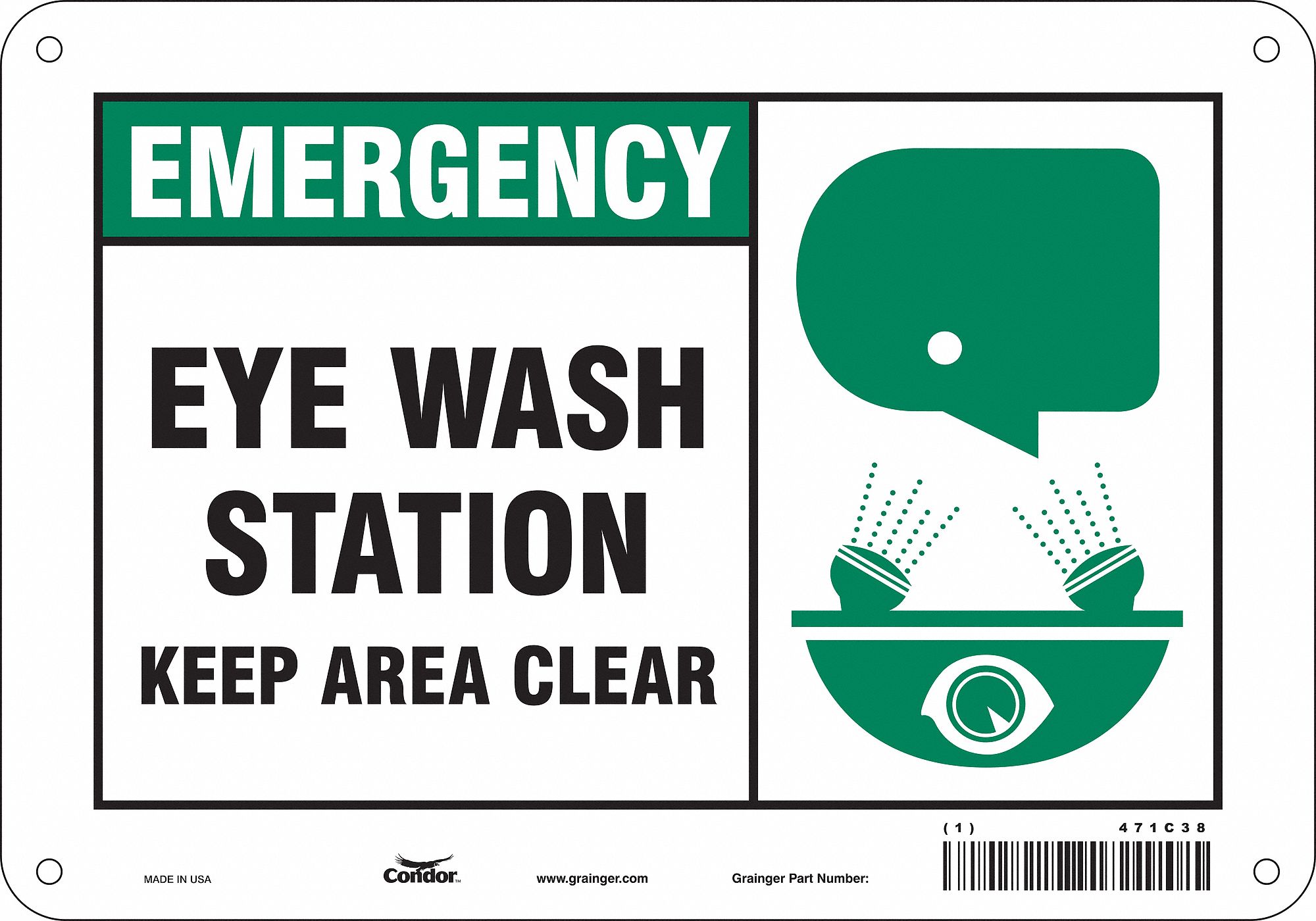 CONDOR Safety Sign, Eye Wash Station Keep Area Clear, Sign Header