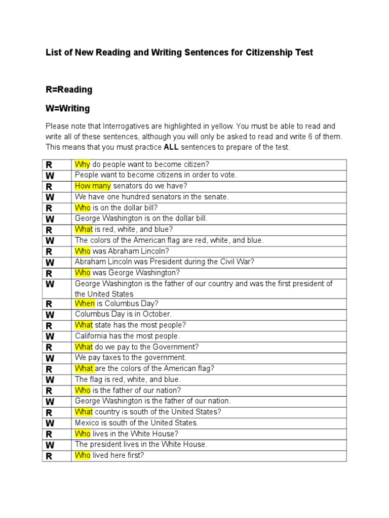 list of new reading and writing sentences for citizenship test clm 2015